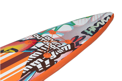 Esta prancha de corrida é feita de material tecido reforçado, que é mais leve e rígido do que os materiais comuns com ponto de gota, tornando-a a escolha ideal para entusiastas de pranchas de corrida. Suas nadadeiras também são mais rígidas e feitas de um material melhor do que as das pranchas comuns, permitindo maior velocidade na água e ajudando os corredores a superar obstáculos. O design deslumbrante do quadro certamente atrairá a atenção. O esquema geral de cores laranja combinado com um estilo de letras exclusivo certamente atrairá pessoas elegantes e modernas. A tecnologia de emenda EVA de alta qualidade garante qualidade excepcional em cada detalhe.