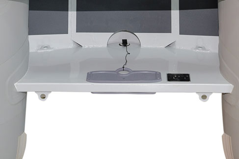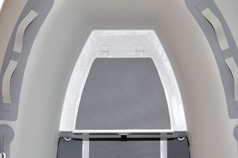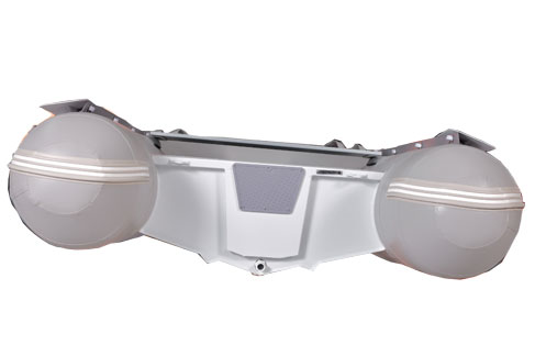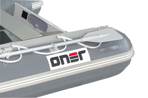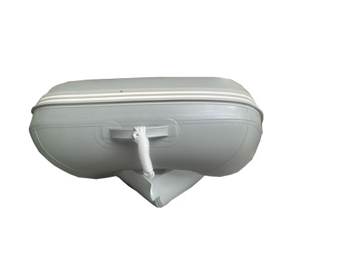 Possui pontões cinza escuro combinados com um casco de alumínio branco, dando ao seu pequeno barco um impacto visual sofisticado. Uma faixa anticolisão e resistente à abrasão de 8 cm de largura ao redor do casco protege-o eficazmente contra impactos e desgaste. O design em liga de alumínio de camada dupla com cabine dianteira proporciona maior robustez e mais espaço aproveitável; a cabine dianteira pode conter itens essenciais para sua viagem marítima. A configuração padrão do barco RIB inclui duas placas de assento em liga de alumínio, uma bomba de pé e um kit de reparo.
