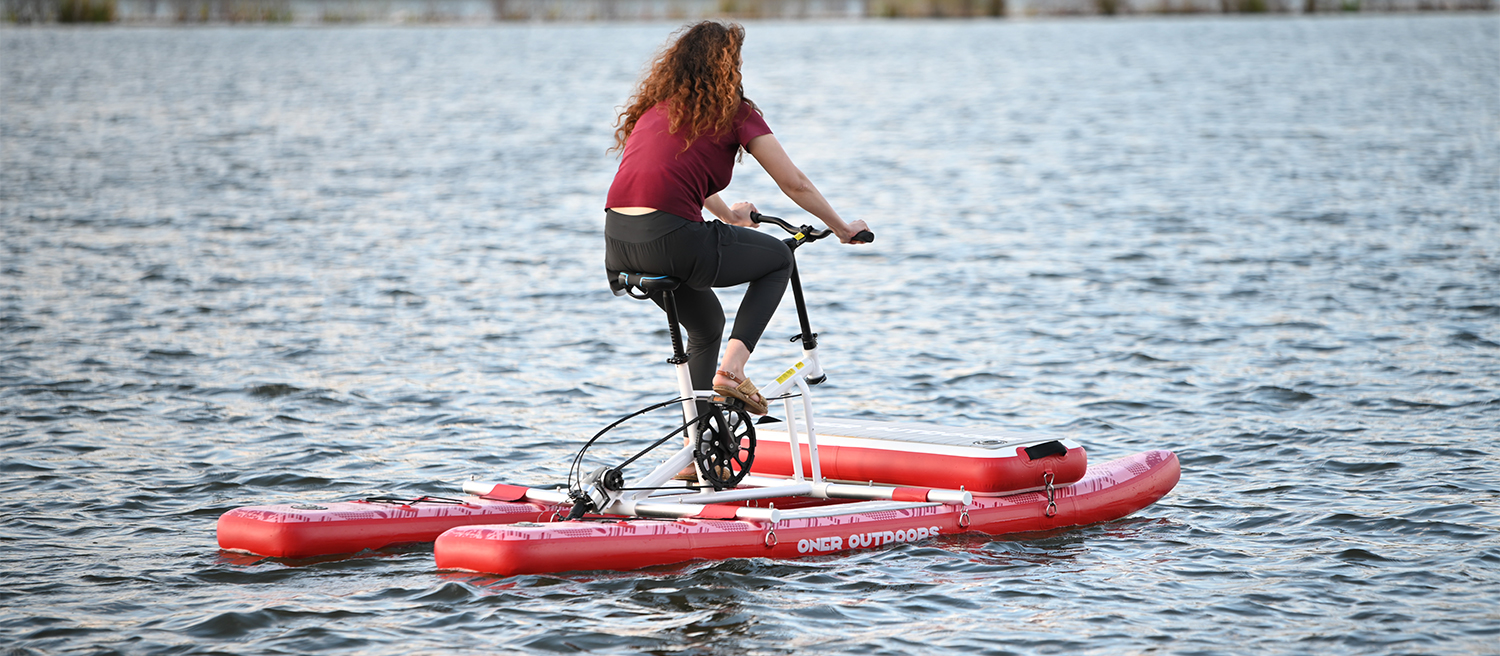As bicicletas aquáticas ONER OUTDOORS não requerem potência para propulsão e habilidade mínima. Se você anda de bicicleta em terra, certamente poderá usar esta bicicleta aquática. Possui duas placas de material escovado para suporte na parte inferior e uma placa horizontal na parte superior permite que seu animal de estimação ou criança se sente confortavelmente. O quadro utiliza componentes de alta qualidade resistentes à água do mar, garantindo uma longa vida útil à bicicleta.